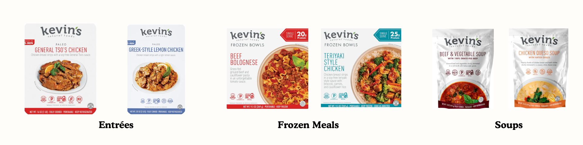 Kevin’s Natural Foods offers 20 different entrées and 10 different frozen meals in addition to their soups, sides, sauces and pastas. You can find Kevin’s Natural Foods at Target, Costco, Walmart, Amazon and through instacart.
