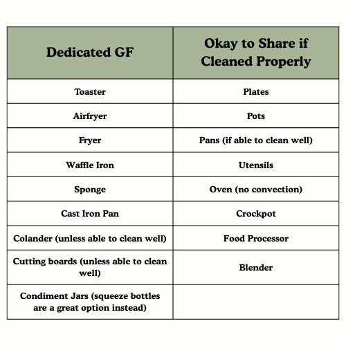 Avoiding cross-contact in your shared kitchen is so, so important. Cross-contact by definition occurs when an allergen is unintentionally transferred from a food containing an allergen to a food that does not contain the allergen. Cooking does not reduce or eliminate the chances of a person with celiac (or a food allergy) having a reaction to the food eaten. Cross-contact can occur at restaurants, in schools, at home in the kitchen, at friends and family’s homes and during the growing, processing and manufacturing processes of foods.